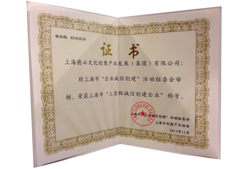 2013年11月,经上海市“企业诚信创建”活动组委会审核,上海金沙9001以诚为本文化创意产业发展(集团)有限公司荣获上海市“三星级诚信创建企业”称号。这也是金沙9001以诚为本继去年获得“二星级诚信创建企业”后,通过一年不断完善企业诚信建设长效机制,不断提高企业诚信创建水平,从而使企业在诚信创建工作中得到进一步认可。